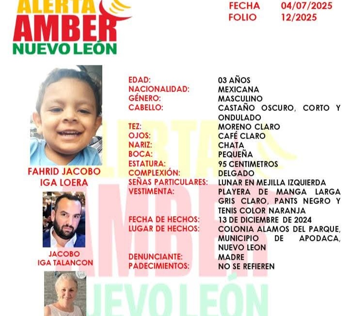 La Fiscalía General de Justicia del Estado de Nuevo León activó una Alerta Amber para localizar al niño Fahrid Jacobo Iga Loera, de 3 años de edad, quien fue sustraído de manera violenta el pasado 13 de diciembre de 2024 en la colonia Álamos del Parque, en el municipio de Apodaca.