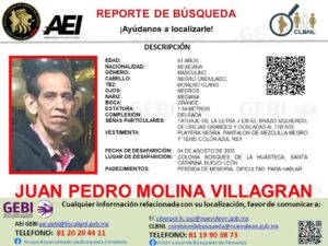La Fiscalía General de Justicia del Estado de Nuevo León emitió un reporte de búsqueda para localizar a Juan Pedro...