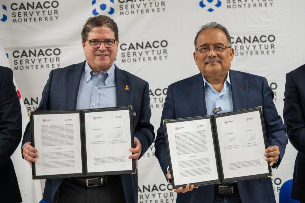 El convenio fue firmado por el Alcalde Andrés Mijes y Jaime Herrera, Presidentede CANACO SERVYTUR Monterrey, en su mensaje, Mijes destacó que este acuerdo refleja lo mejor del espíritu norteño que es la capacidad de unir esfuerzos para crecer con justicia y prosperidad compartida.