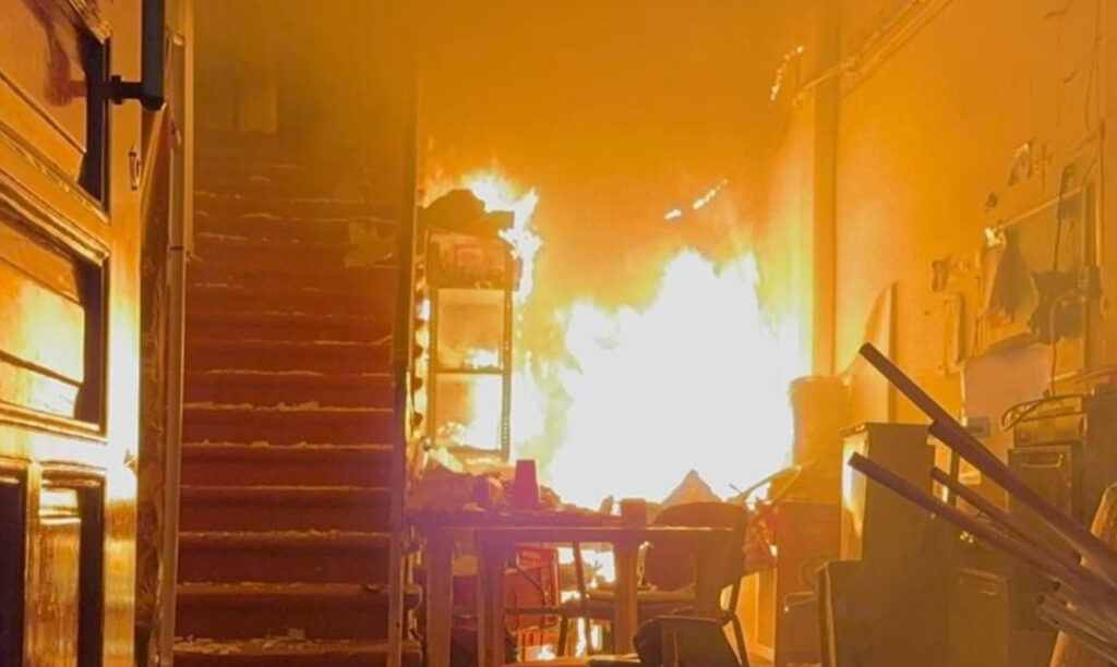 Acto seguido por la fuerza varios encapuchados ingresaron a las instalaciones municipales a destrozar mobiliario y prendieron fuego en algunas áreas al interior, subieron al segundo piso donde continuaron los destrozos y colocaron una manta en el barandal con la leyenda “Fuera Fanny”. El palacio municipal fue destrozado.