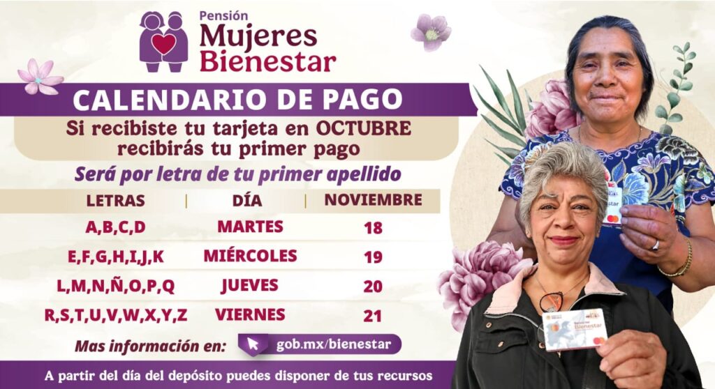 El Gobierno de México informó que, del 18 al 21 de noviembre, las mujeres de 60 a 64 años que se registraron en agosto a la Pensión Mujeres Bienestar y recibieron su tarjeta en octubre, recibirán su primer pago de 3 mil pesos bimestrales.