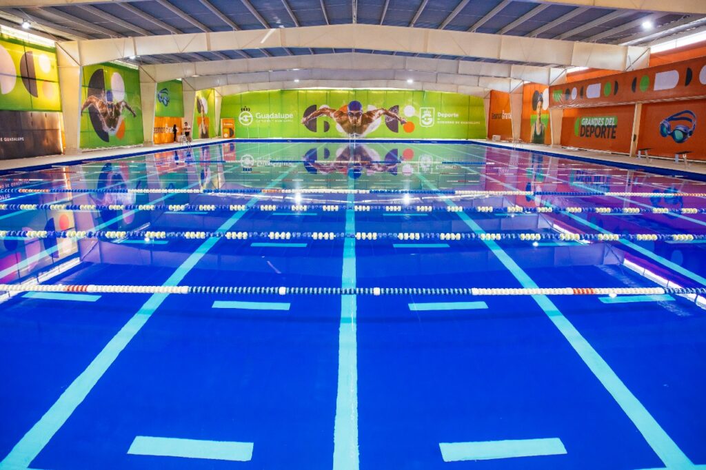 El Gobierno de Guadalupe invirtió 13 millones 400 mil pesos en infraestructura deportiva, renovando en su totalidad la alberca olímpica que recibió trabajos de rehabilitación con máquinas nuevas, caldera, el agua limpia, equipo nuevo de filtración y nueva iluminación.