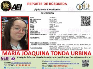 La Agencia Estatal de Investigaciones (AEI) de Nuevo León emitió un reporte de búsqueda para localizar a María Joaquina Tonda...