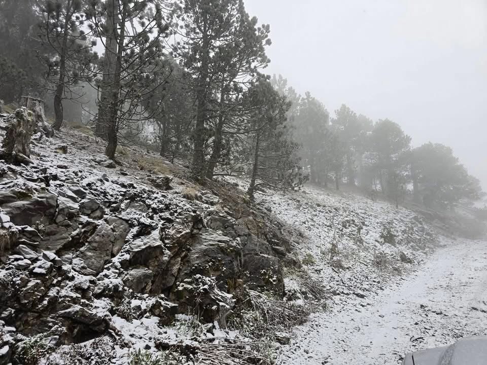 Se registra caída de nieve en las zonas más altas del Cerro del Potosí, en Galeana, el punto más alto del noreste de México.