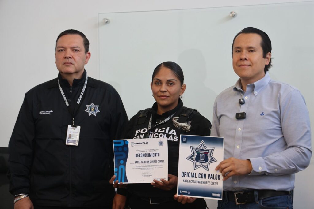 Por su destacado manejo y aplicación de protocolos para proteger la integridad de menores, el Alcalde de San Nicolás, Daniel Carrillo Martínez, reconoció la labor de la oficial Karla Catalina Chairez Cortéz, quien a pesar de las presiones verbales de terceras personas mantuvo la serenidad y respeto para salvaguardar la integridad de menores que fueron sorprendidos conduciendo un automóvil en estado de ebriedad.