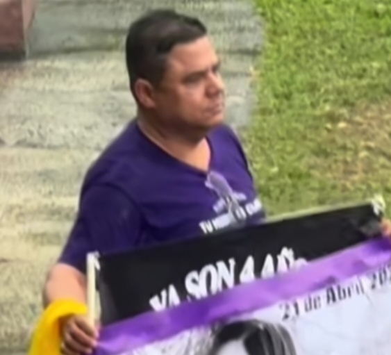 Escobar fue captado a un costado del recorrido portando un cartel con la fotografía de la joven y reiterando su exigencia de que se esclarezca el caso.