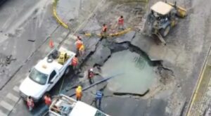 N+.-Luego de que se reportara la fuga de agua potable en una tubería de Agua y Drenaje de Monterrey, la avenida Adolfo López Mateos,en...